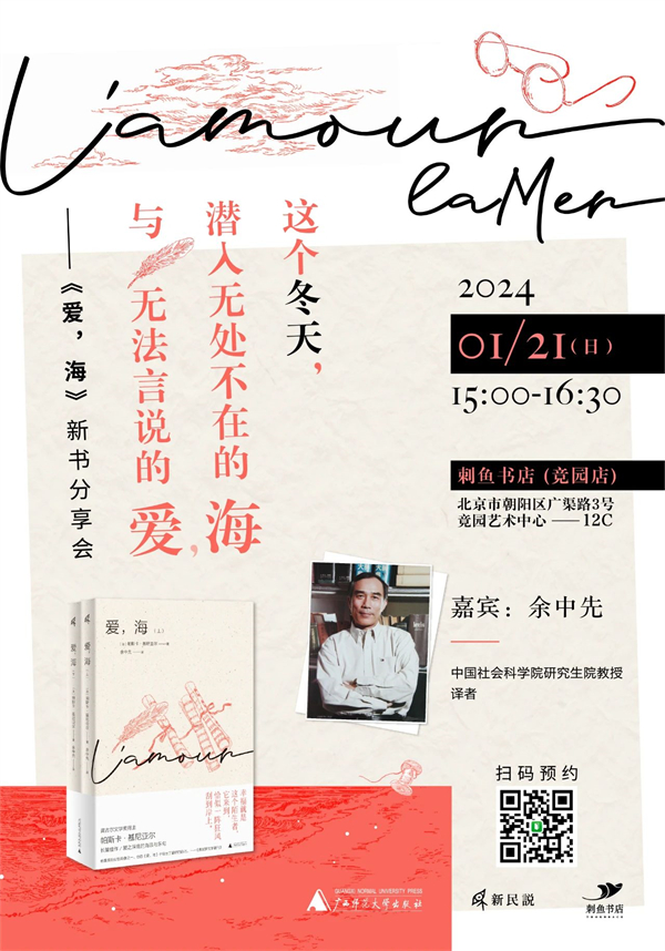 法国当代作家帕斯卡·基尼亚尔自幼开始接触语言学和音乐,接受过系统的哲学教育,具备出色的语言功底、音乐素养和哲学思辨能力。他的作品因“将历史想象、文学虚构、艺术审美和哲学思辨融为一体的创造性写作”而屡获各类文学大奖。1月21日下午,广西师范大学出版社·新民说和刺鱼书店特别邀请中国社会科学院研究生院教授、知名译者余中先,与读者朋友们一同,在这个冬天,潜入基尼亚尔笔下无处不在的海与无法言说的爱。