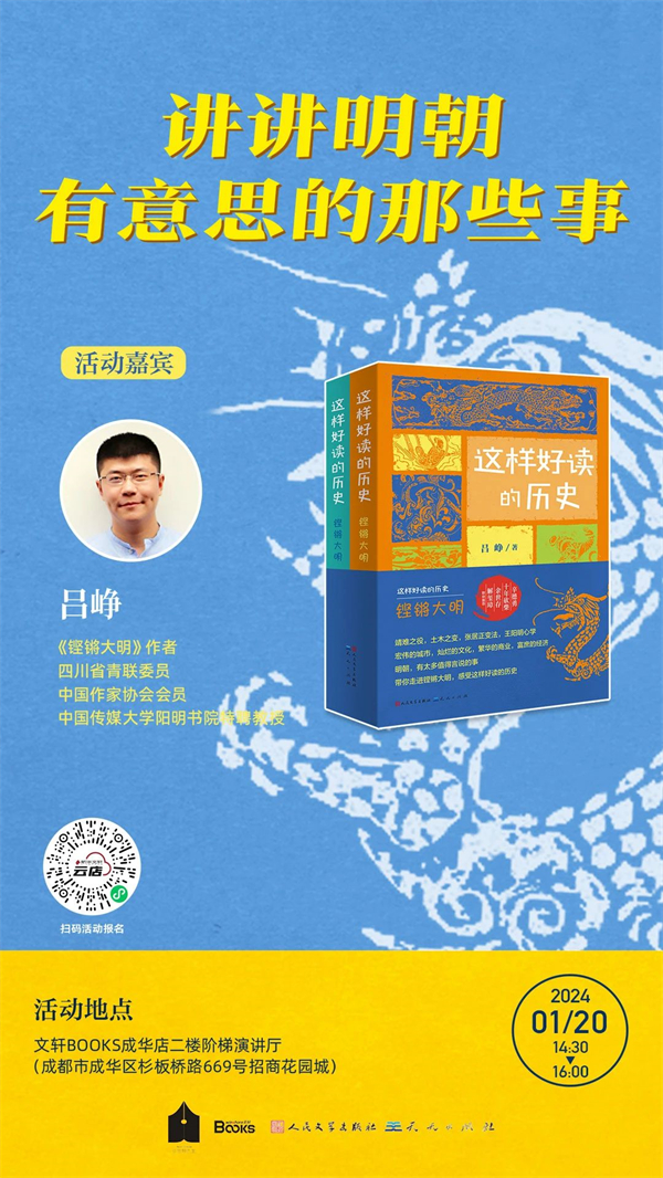 1月20日,我们邀请到《铿锵大明》作者吕峥做客文轩BOOKS成华店,分享这本新书,让我们跟随作者一起回到历史中,以时间为线,了解明代的历史变迁和风云变幻。