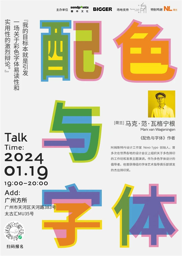 为了给传统黑白字体的排印方式增色添彩,荷兰字体设计师马克·范·瓦格宁根一直不断研究颜色与字体的组合。他的著作《配色与字体》就是专门研究、设计与运用彩色字体,为彩色字体设计师提供全新设计思路。经过设计师的设计,彩色字体一样可以像黑白字体那样有用又可读,开创一个新时代!月19日晚,马克·范·瓦格宁根将做客广州方所,举办一场关于彩色字体设计与应用的分享会,为现场增添一丝来自阿姆斯特丹的新鲜设计。
