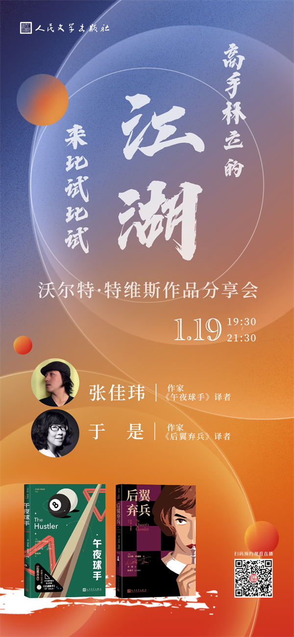 沃尔特·特维斯在英美世界属于主流的畅销书作家,有着从严肃文学作家到普通读者这样广泛的庞大读者群。本次活动我们特别邀请到作家、《午夜球手》译者张佳玮,《后翼弃兵》译者于是,以译者、作家和台球、国际象棋爱好者的多重身份,来跟书友们分享热爱并热衷书写竞技体育的作家沃尔特·特维斯在其作品中展露的独特魅力。