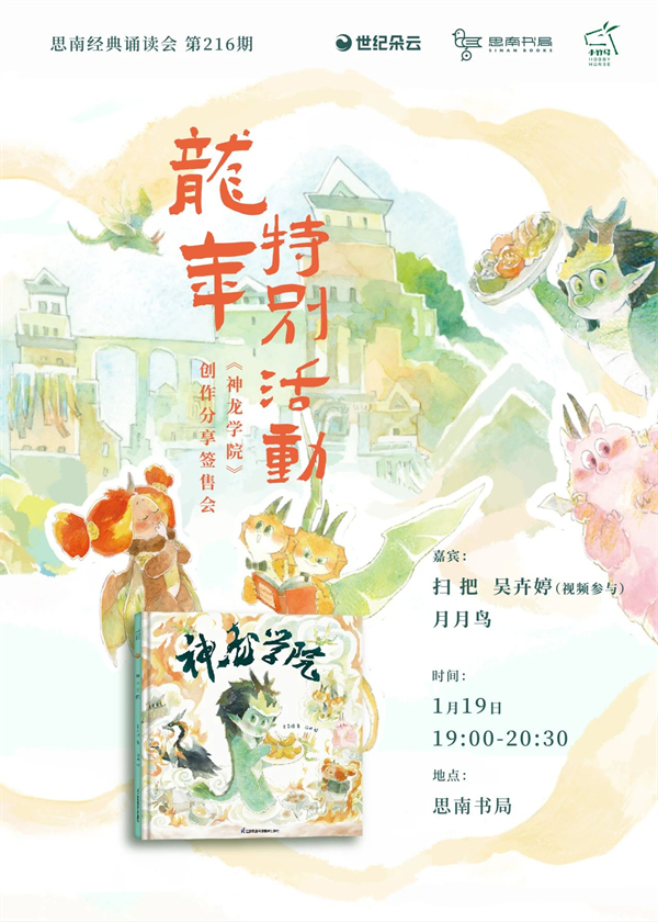 《神龙学院》是一本讲述东西方交流、教孩子探索个体的绘本。1月19日晚,在思南书局,《神龙学院》的绘者扫把、作者吴卉婷、编辑月月鸟,将同小朋友们一起“游览”神龙学院!