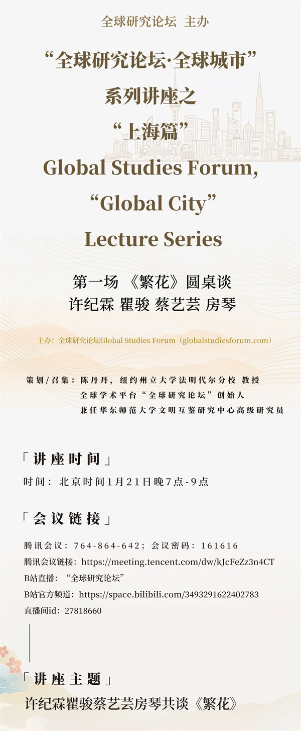 “全球研究论坛·全球城市”系列讲座之上海篇,第一场《繁花》圆桌谈,邀请许纪霖、瞿骏、蔡艺芸、房琴四位学者线上共谈《繁花》。