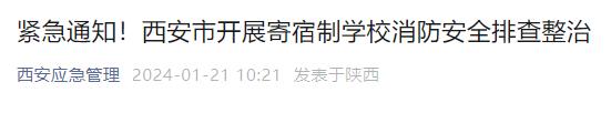 1月21日,西安市应急管理局发布消息称,1月20日,西安市消防安全委员会办公室联合西安市安全生产委员会办公室,就开展寄宿制学校消防安全排查整治印发紧急通知。