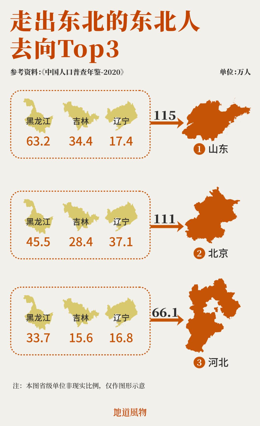 而放眼整个东北,这些“候鸟”不过是一朵小浪花。东三省内,东北人以百万级的规模,从黑龙江走向吉林,从吉林走向辽宁;东三省之外,山东、北京、河北,则成为1101万离开东北的东北人的首要选择。