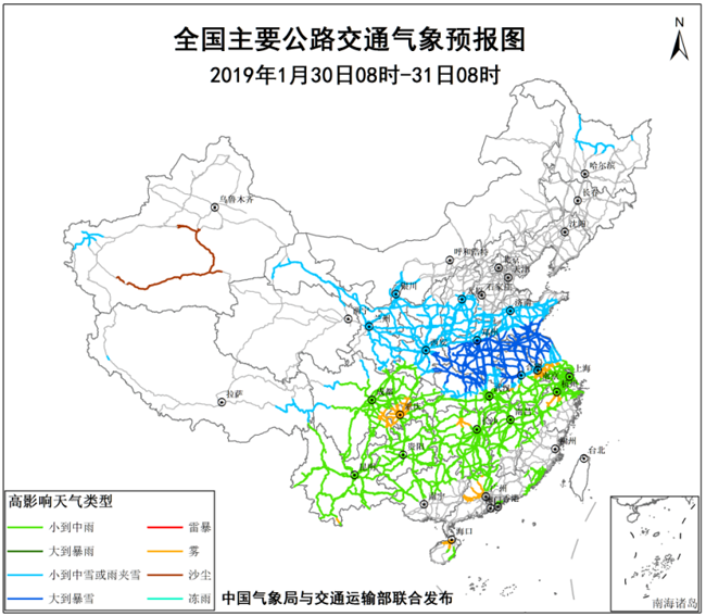 图3 全国公路气象预报图(1月30日08时-31日08时)