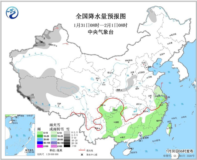 图1 全国降水量预报图(1月30日08时-31日08时)