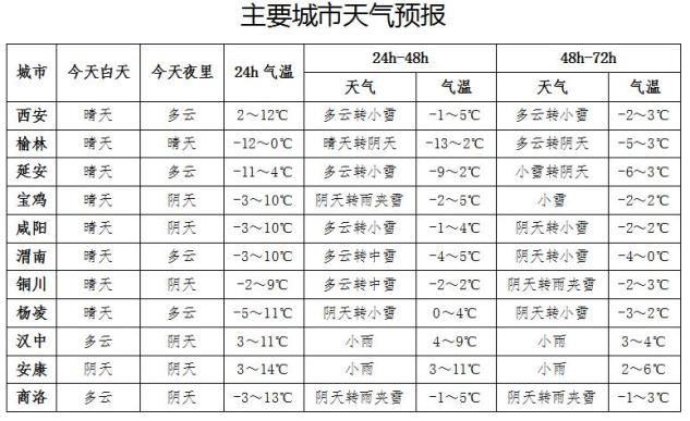 19日:全省阴天,陕北、关中、商洛和秦巴山区有中雪,汉中和安康雨夹雪或小雪。