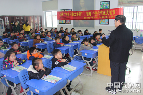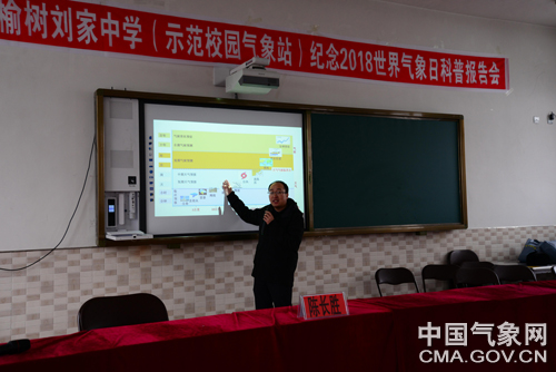 在刘家镇第一中学的食堂大厅,近三百人的观众济济一堂。省气象台正研级高级工程师陈长胜以《新时期天气预报与气象防灾减灾》为主题,为听众作科普报告会。省气象学会为刘家镇第一中学的学生、家长及周边群众发放《气象与生活科普知识图册》《雾和霾的那些事》等气象科普宣传图册和书籍,组织他们参观校园气象观测站,共同学习气象防灾减灾知识。