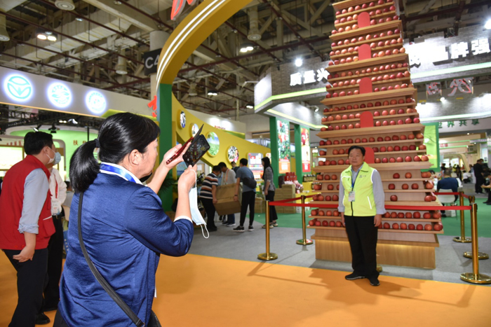 上午9时许,第二十一届中国绿色食品博览会展馆开放。在C4馆,陕西展区用苹果堆砌起的“大雁塔”,格外吸引眼球,吸引着客商驻足脚步拍照留念,香甜四溢的果香扑面而来,透过口罩沁人心脾。