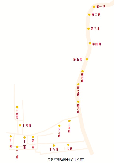 现在,虽然上下九、第十甫、十一甫等带“甫”字的地名保留了下来,但与过去相比,还是有了不小的变迁。比如,明代开凿大观河后,十四甫本在船舶出柳波涌、入珠江的航道附近(大致在今十八甫北路附近),不过,后来河道淤塞,码头渐移,十四甫逐渐就消失了。据《荔湾区志》,原本位于今装帽街和桨栏路一带的十五甫、十六甫,因清道光年间的一场大火,易地重建于今宝华路一带,并取名十五甫正街、十六甫新街,以示传承与区别。十七甫后来也并入了十八甫,如今十八甫路旁还有一条名叫“十七甫北”的小巷子,算是保留了一点记忆。
