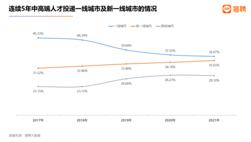 猎聘的《2022新一线城市人才吸引力报告》显示,从2017-2021连续五年来中高端求职者投递一线和新一线城市的占比来看,一线城市呈下降趋势,从2017年的45.33%下降到2021年的36.87%;与此同时,新一线城市的投递占比则从31.52%上升到2021年的35.03%,越来越趋近于一线城市。同一时间段,应届生投递一线及新一线城市也呈现相似的趋势。