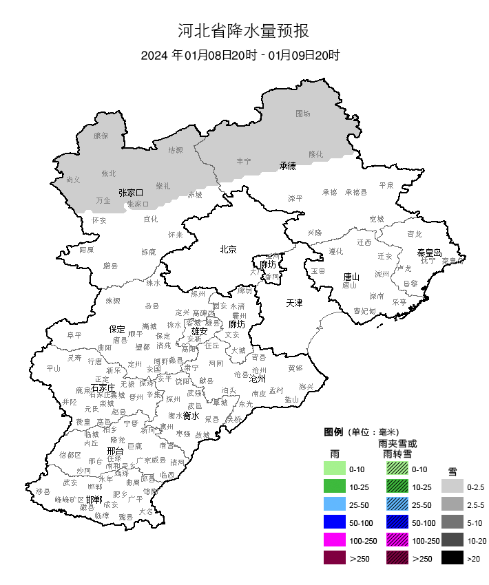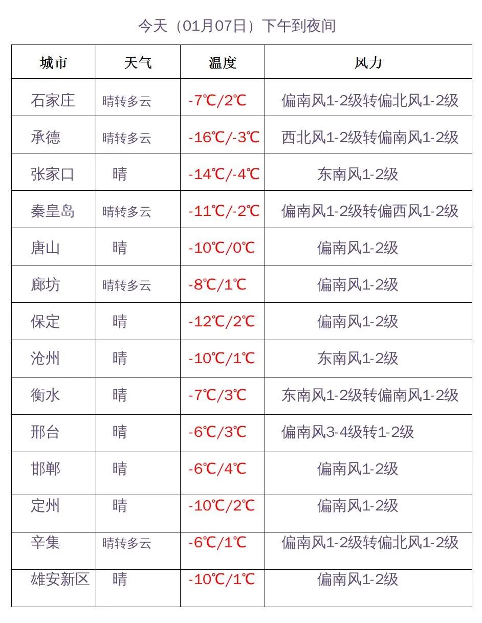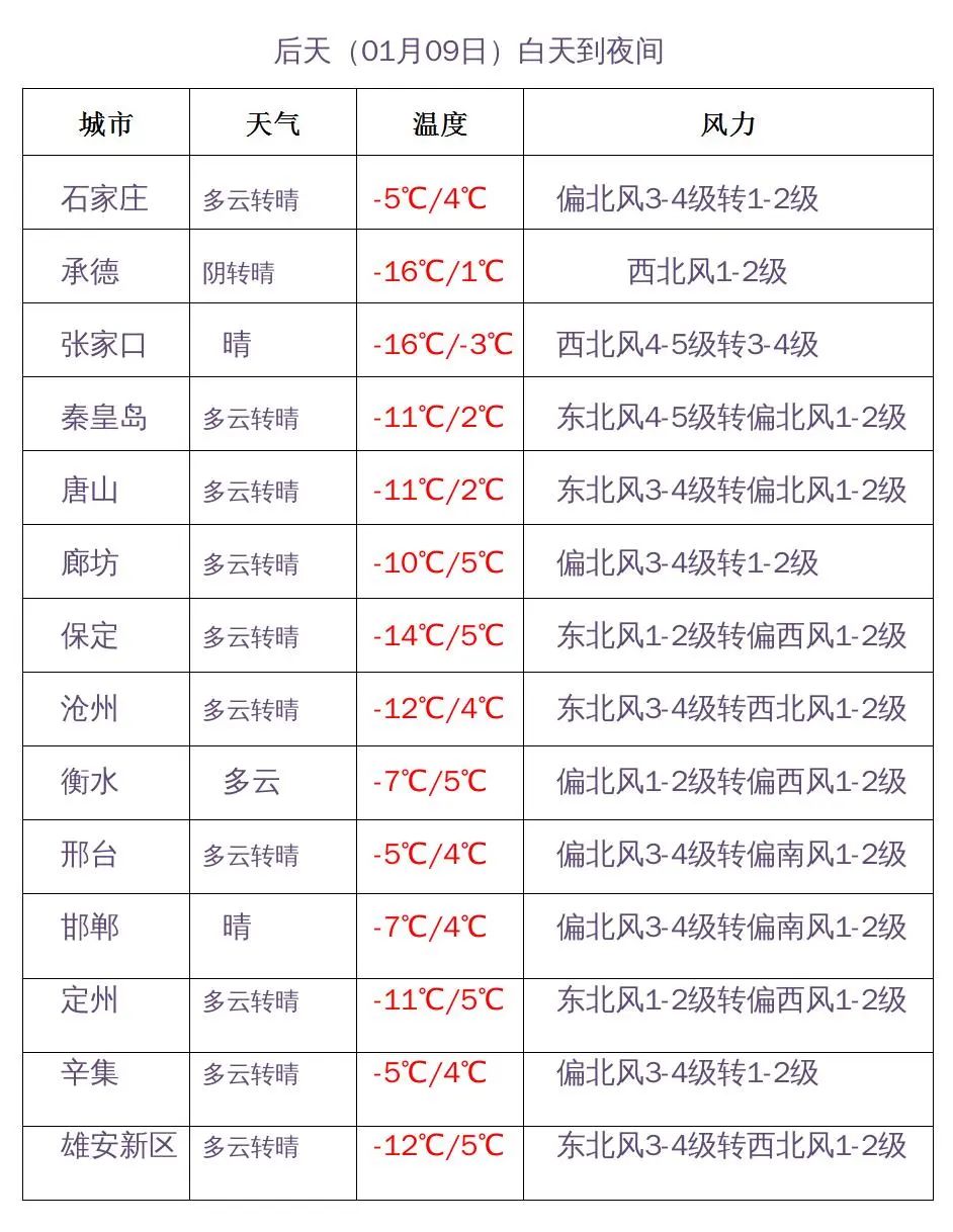 最低气温也多波动,今天最低气温,张家口、承德、秦皇岛北部、保定北部-27~-12℃,其他地区-11~-5℃。8日气温略升。到了10日,北部地区下降4~7℃。