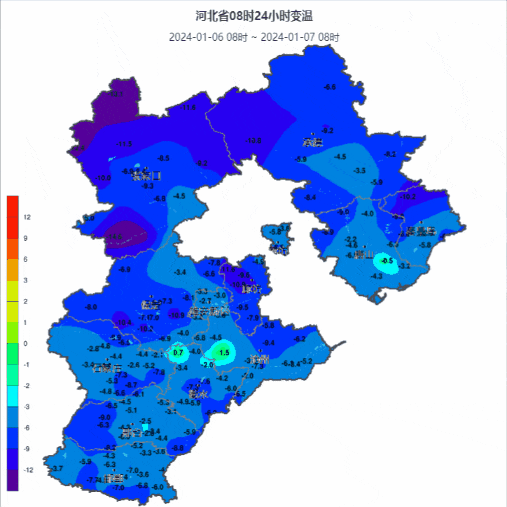 今早冷空气发力,降温那是立竿见影。今天8时与昨天同一时刻相比,河北大部地区出现5~8℃的降幅,局地降幅超10℃。降温后,西北部最低气温跌至-15℃以下,其中,康保最低为-30.1℃,天寒地冻。