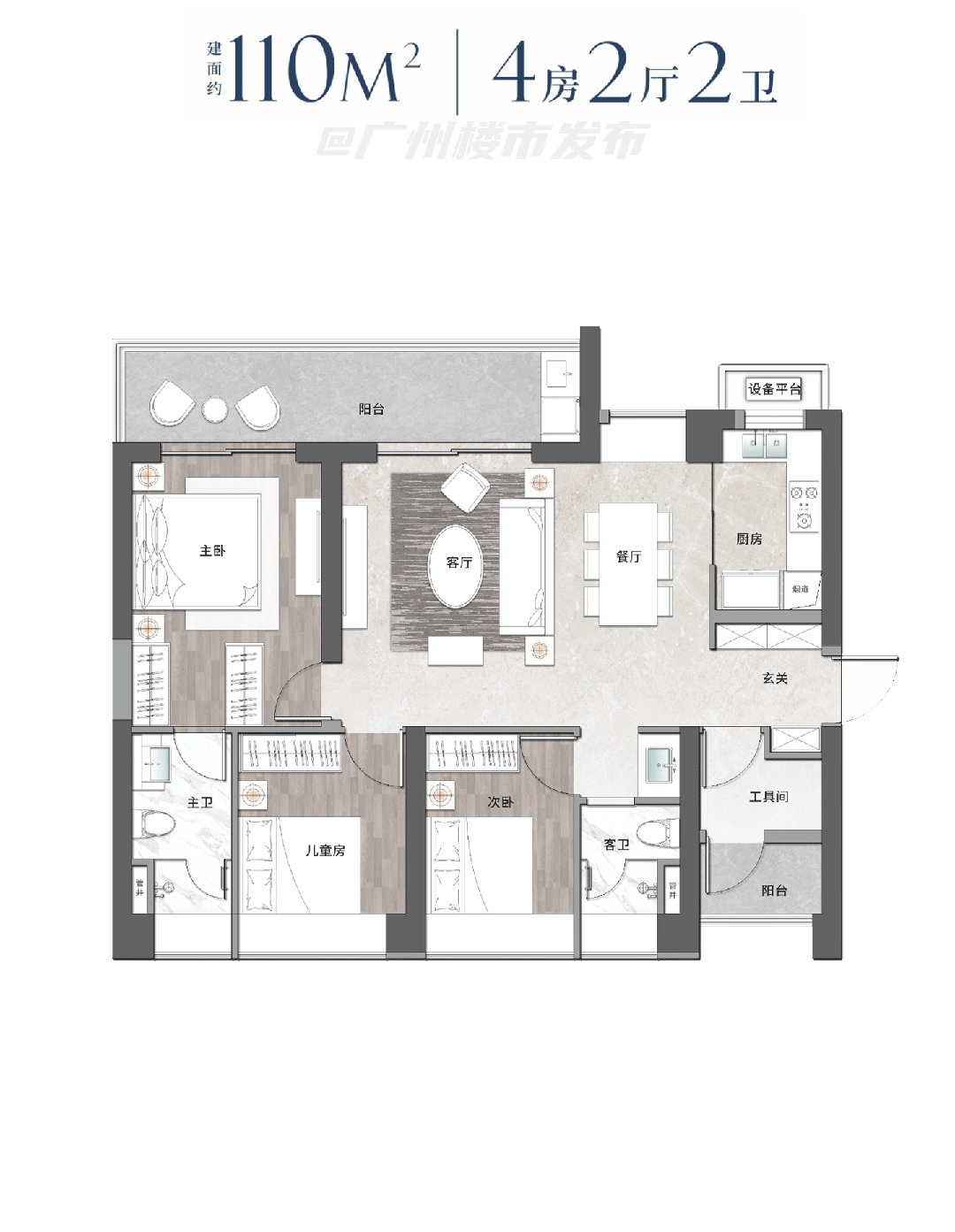 这样的高品质投入,不只发生在社区,对于室内空间的思考同样超出预期。项目所推出约110-125平四房,通过面积控制总价,但仍延续大平层“MAX宽居”体验,如超长阳台、大横厅、大主套等。以建面约110平四房为例,借助更多领先设计和细节改善,去放大场景体验。其不仅空间使用率高,功能与尺度兼具,三开间观景的效果更饱满。这款户型将“江、海、CBD”三重景观叠加,富有层次感。在广州,往往只有10万+豪宅,才有如此景观配置。