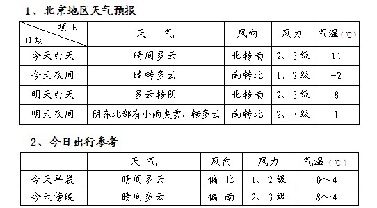 除今明两天天气预报外,《气象服务专报》还包括“今日生活气象指数”以及北京市气象台与北京市环境保护监测中心联合发布的“今日空气质量预报”。“今日生活气象指数”涵盖穿衣、晨练、感冒等气象指数。在“两会”期间,北京市气象台将继续发布《气象服务专报》,供社会公众及“两会”委员和代表参考。
