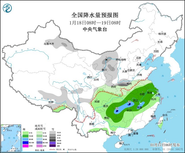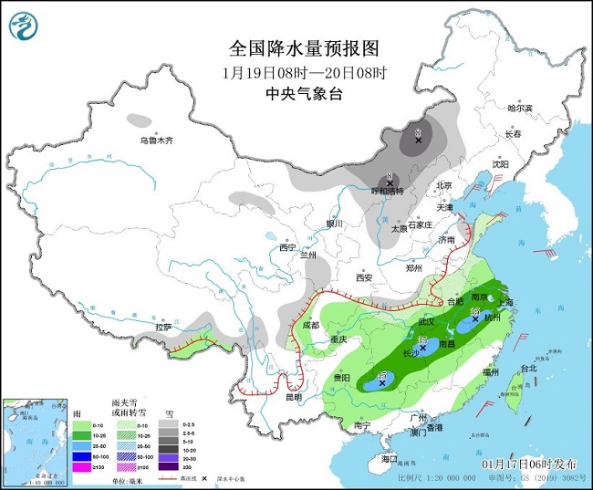 17日至19日,西南地区东部和南部、西北地区东部、黄淮东部、江淮、江汉、江南等地有较大范围雨雪天气过程。山西北部、河北中北部、山东半岛、内蒙古西部、陕西、河南及湖北北部等地有雨转雨夹雪或小到中雪,局地大雪;西南地区东部和南部、江汉、江淮、江南、广西、广东西北部等地部分地区有小到中雨,其中江汉、江南北部、贵州等地部分地区有大雨,局地暴雨。17日至18日,新疆北部有小到中雪,其中,沿天山地区局地有大雪。