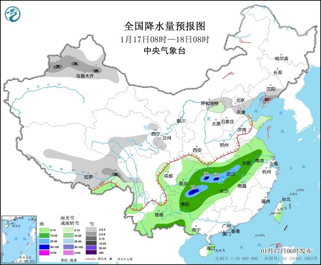 1月17日08时至18日08时,新疆北部、西藏东部、青海南部、山西北部、河北中部、辽东半岛、山东半岛等地部分地区有小到中雪或雨夹雪,其中,辽东半岛、新疆沿天山地区等地局地有大雪(5~8毫米)。江淮、江汉、江南北部和西部、西南地区东部和南部等地部分地区有小到中雨,其中,湖北南部、湖南北部、贵州东北部等地部分地区有大雨或暴雨(50~70毫米)。内蒙古中东部、辽东半岛等地部分地区有4~5级风(见图1)。