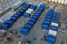 1月24日,工作人员在乌什县一处安置点搭建应急救灾帐篷(无人机照片)。新疆维吾尔自治区应急管理厅发布通报,截至23日20时许,此次地震已造成3人遇难、5人受伤,转移安置12426人。