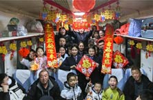1月25日,在抚远开往哈尔滨的K7066次列车上,列车工作人员在活动后与旅客合影留念。春运来临,国铁哈尔滨局牡丹江客运段抽调文艺骨干组成春运文艺服务演出小分队,在列车上举行“温暖春运回家路”为主题的联欢慰问活动,让旅客度过温馨快乐的旅程。