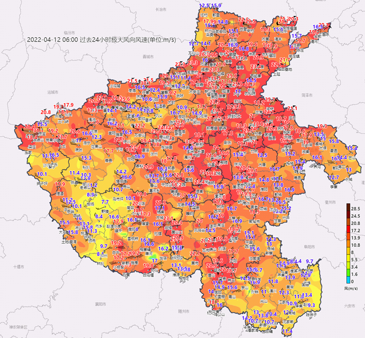 大风:11日06时到12日06时,我省大部分地区出现7~9级大风,三门峡、洛阳、安阳、济源、焦作、新乡、郑州、开封和许昌九地区局部出现10~12级大风,最大风速许昌禹州无梁站33.5米/秒(12级),郑州登封清凉寺25.4米/秒(10级)。