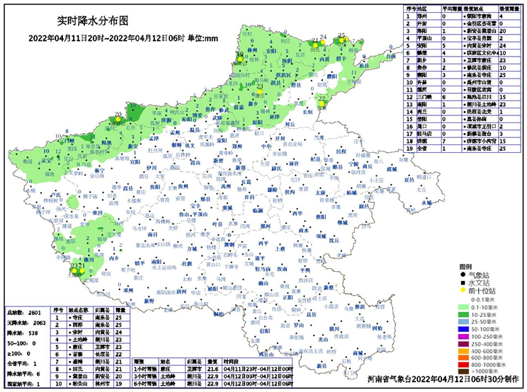 图1 2022年4月11日20至12日06时河南省降水分布图