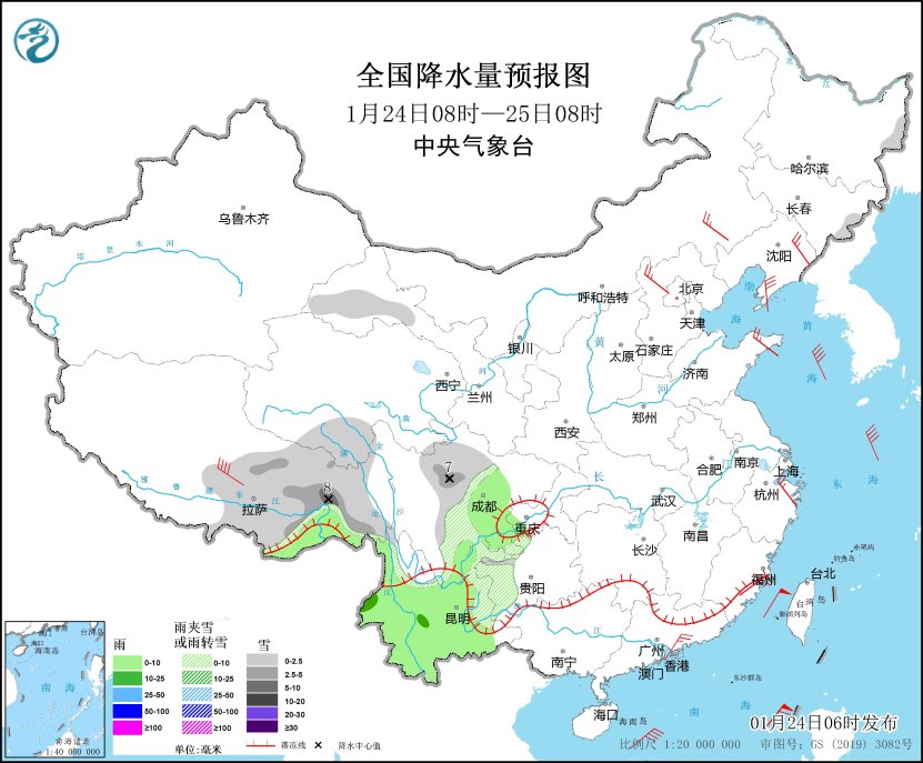 图3 全国降水量预报图(1月24日08时-25日08时)