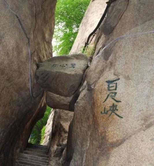 "百尺峡"也叫"百丈崖",仍是一处危石耸峙,直插云表,令人望而生畏的地方。"过千尺幢向北折即到"百尺峡",它是登华山的第二个险境。