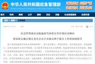 应急管理部决定于1月31日10时针对河北、山西、江苏、山东、河南、湖北、陕西等地启动低温雨雪冰冻灾害Ⅳ级应急响应。国家防灾减灾救灾委员会办公室、应急管理部联合公安部、交通运输部、国家能源局、国铁集团等部门单位于1月31日派出2个工作组,分赴河南和湖北协助指导低温雨雪冰冻灾害防范应对工作。