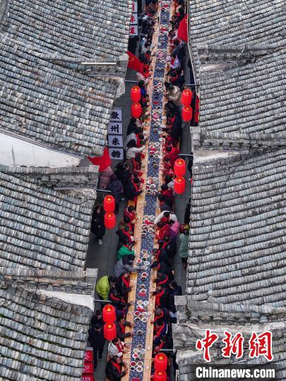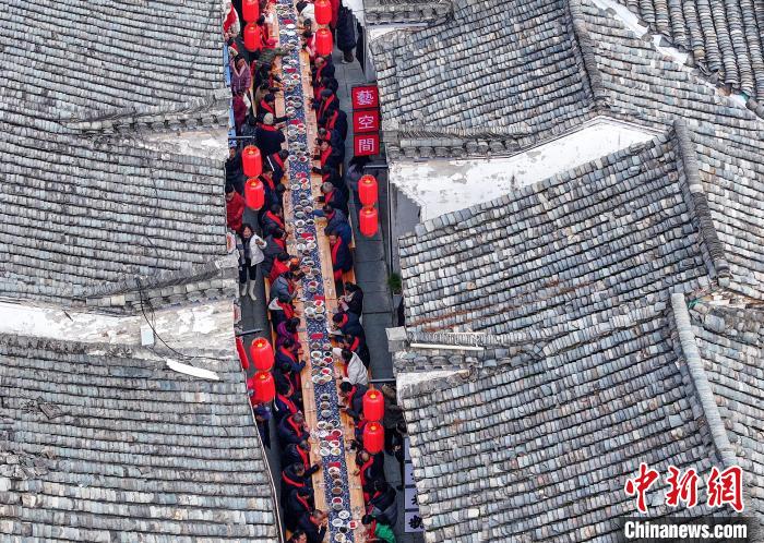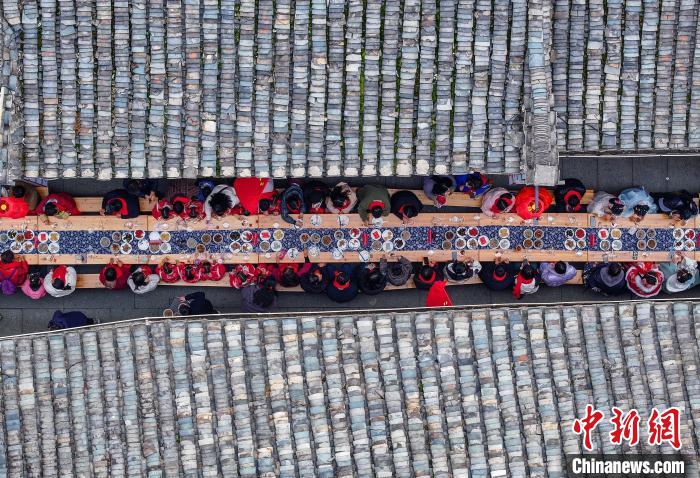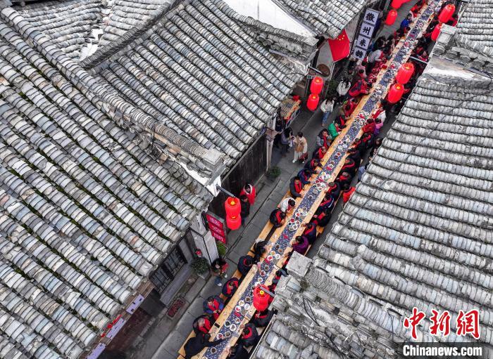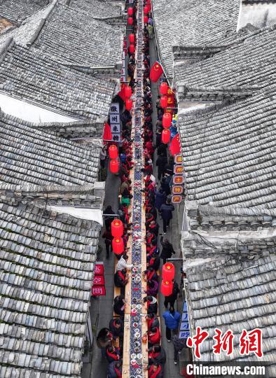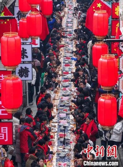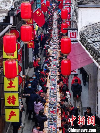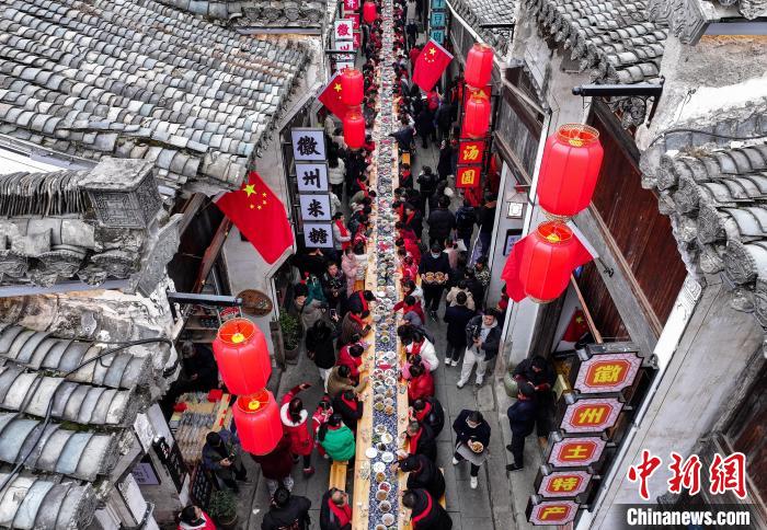1月30日,以“就在徽州过大年”为主题的长桌宴迎新春活动在安徽省黄山市徽州区岩寺老街举行,36张长桌上摆放着地地道道的徽州美食,游客在欢声笑语中品尝长桌宴,感受浓浓徽州年味。