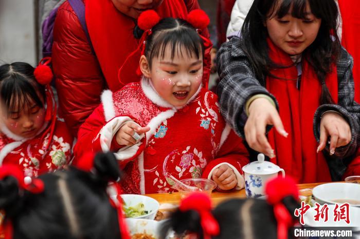 1月30日,游客在安徽省黄山市徽州区岩寺老街体验品尝长桌宴。施亚磊摄