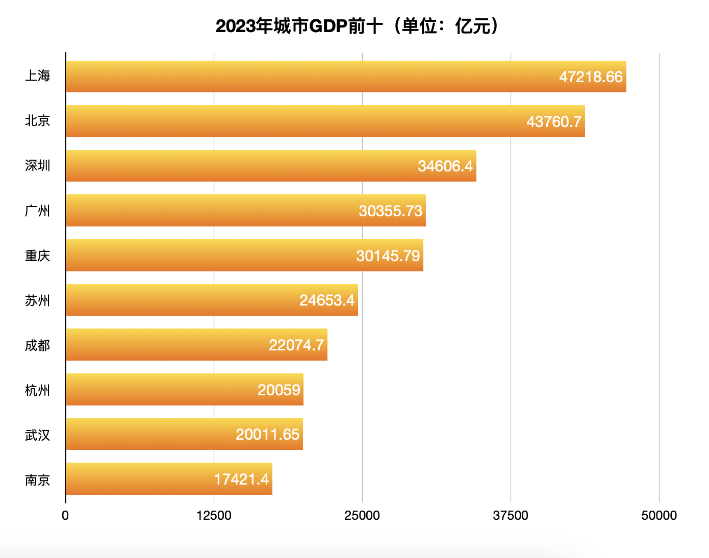 目前十强城市除了南京以外,其他全部跻身2万亿,而国内头部城市竞争的门槛则来到了3万亿。