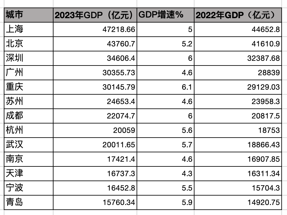 万亿城市的另一个看点还在于是“十强城市卡位战”。2023年GDP第十城是南京,近1.75万亿。身后是天津、宁波和青岛,3个城市在2023年GDP分别是1.67、1.64、1.57亿元。