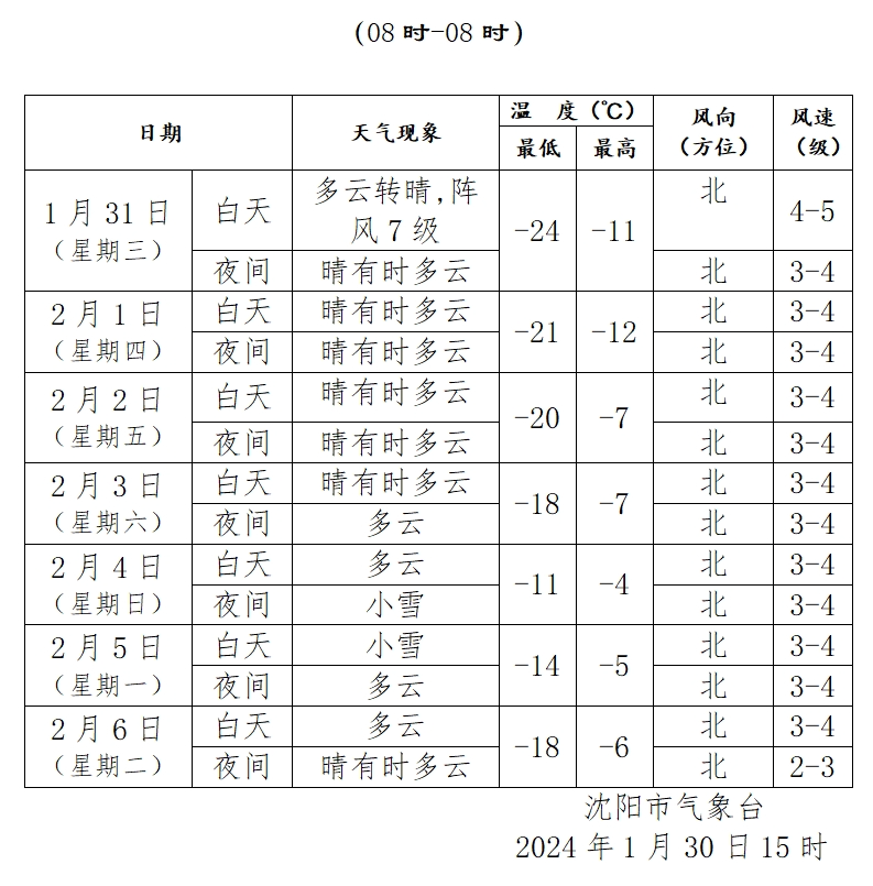 预报:预计30日16时至31日7时,沈阳地区有大雪,平均降雪量5~10毫米,新增积雪深度4~8厘米,城区降雪开始时间为30日18时前后,结束时间为31日7时前后,城区主要降雪时段为30日20时至31日3时。降雪过后气温将下降10~12℃,2月1日早晨最低气温为-25~-23℃。1月30日夜间至31日白天,偏北风4~5级,阵风7~8级。