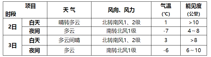 预计2月2-3日,北京地区以晴到多云天气为主,风力不大,大气扩散条件和能见度有所转差,最低能见度4公里;白天最高气温1~3℃,夜间最低气温-7~-6℃。