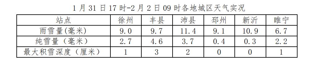 受冷暖气流共同影响,1月31日下午开始我市出现小雨,2 月1日凌晨起转雪。截至2日09时,全市降雪量小到中等,出现不同程度积雪,最大积雪深度 3 厘米(丰县)。