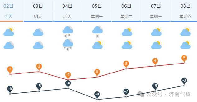 5日阴转多云,早晨到上午小雪,北风转南风3级,最低气温济阳区、商河县、南山区、起步区-9℃左右,市区及其它区县-6℃左右,最高气温-2℃左右。