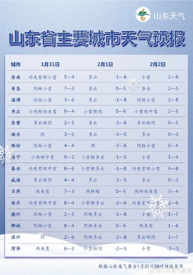今日(2月2日)鲁南地区多云转阴有小雪;3—5日,我省有大范围降雪并伴有大风和降温天气,部分地区有大到暴雪局部大暴雪。公众需关注预警预报信息,尽量避免雪大时段出行。
