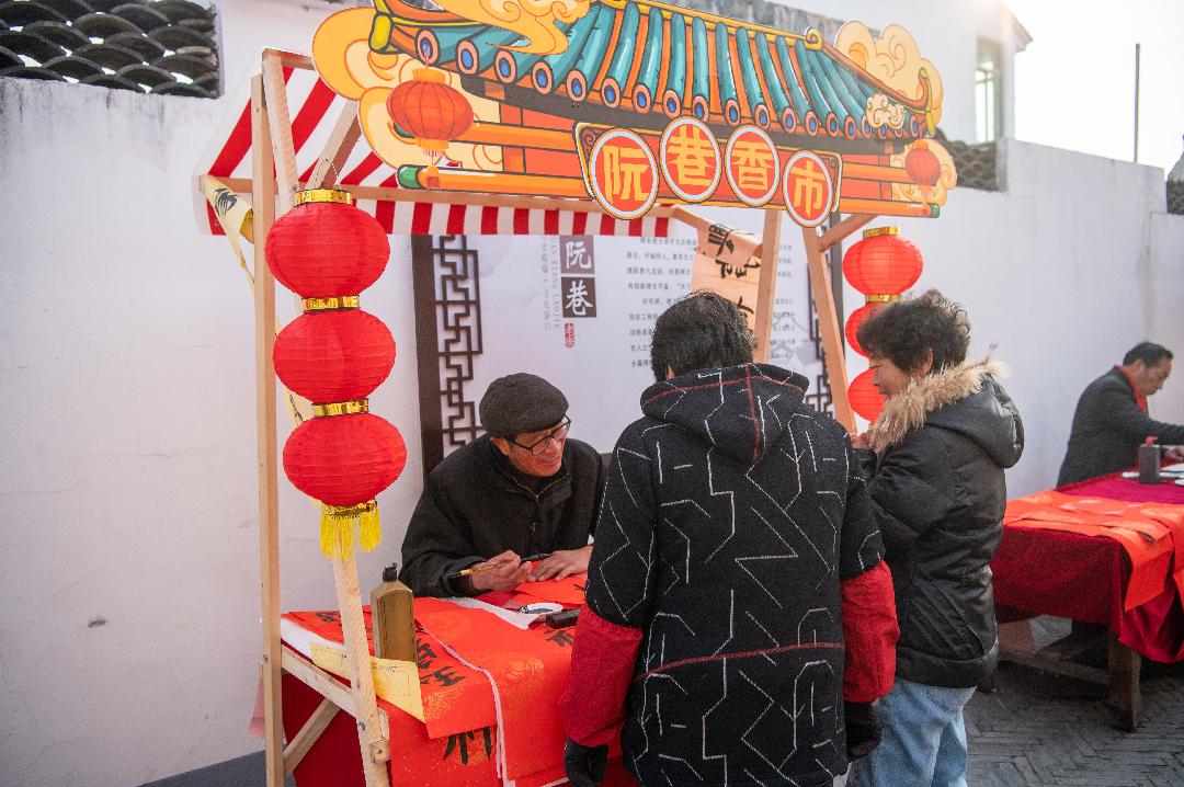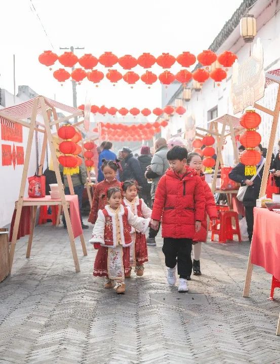 手持民俗年味体验券,可尝糖饺、油墩子、阿婆菜饭等传统小吃,可体验年画拓印、瓷胚作画、土布挂件制作、手工糖画等活动,可参与窗花剪纸、写福字、对联活动,以及趣味小游戏。