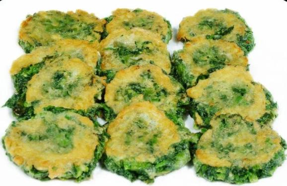 【菠菜饼】这是一道地道的景芝菜,也是安丘各食铺里上桌率较高的一道菜。挑选叶子肥的绿菠菜,与猪肥膘肉、葱姜混合成菠菜馅,一双巧手把它攒成玉雪可爱的绿色团子。反复攒几次后把菠菜团子上覆一层薄薄的面粉,再用手把团子轻轻压成一个个的小圆饼,用平底锅煎熟就出锅了。饼子黄中带绿,色彩鲜亮,预示着春天的到来。装盘后的菠菜饼子须配一碟小米醋,每年年夜饭这个菜一上桌,全家人都会马上蘸一口醋,再放嘴边吹一吹散热,吃到嘴里,满口菠菜清香掺杂着缕缕肉脂香气,一吃一个不吱声。