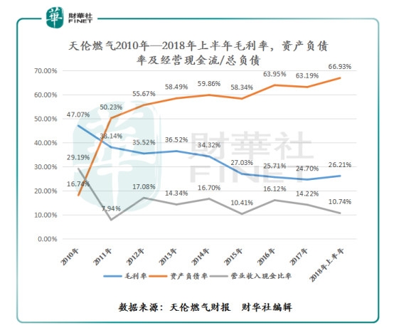 截止2010年—2018年上半年(如下图),天伦燃气的盈利质量有走弱的迹象,毛利率由2010年的47.07%下滑至2018年上半年的26.21%;主要受到该区间内营收占比较大的城市销售燃气业务增长后,拉低整体的毛利率及人工成本和燃气接驳管道原材料成本上升影响所致。值得注意的是,随着市场对推出“相关接驳费调价政策”的呼声越来越高,天伦燃气的政策性风险因素影响也在加大。倘若后市真的推出相关接驳费调价政策,势必会对天伦燃气的净利润带来冲击。因此,投资者务必防范公司毛利率持续下滑的风险。