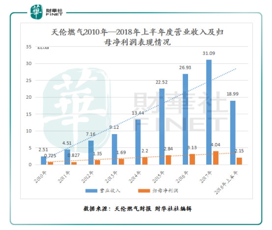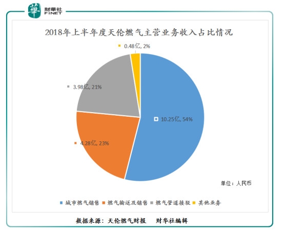 从公司主营业务上看,天伦燃气主营业务可分为城市燃气销售,燃气输送及销售、燃气管道接驳及其他业务。其中城市燃气销售是天伦燃气的主要收入来源。截止2018年上半年,城市燃气销售借助着51个加气站的“输出”,上半年实现收入为10.25亿元,约占总营业收入的54%;