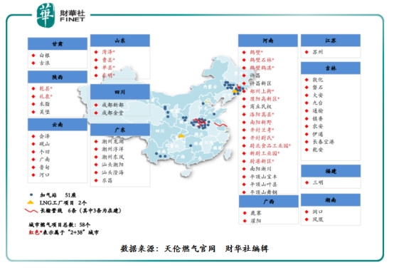 经过十多年的发展,天伦燃气已经成为国内主要的燃气运营商及分销商之一。目前,天伦燃气的经营范围涵盖城市燃气运营、加气站运营、LNG加工厂、长输管线等。公司的项目主要集中在天然气消费高增长区域,如河南省、云南省、吉林省及山东省等地。截至2018年上半年(如下图),天伦燃气在全国16个省份拥有58个城市燃气项目,其中18个项目位于“2+38”城市。此外,公司还拥有51营运中的加油站,6条长输管线(其中3条为在建)及2个LNG工厂项目。
