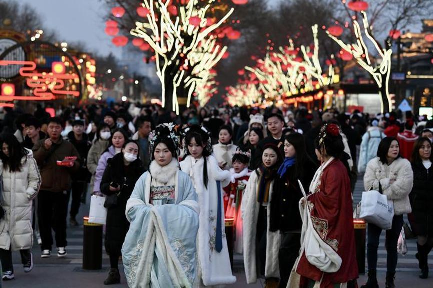 2月7日,市民游客在西安大唐不夜城游览。春节临近,不少游客选择来西安过年,大唐不夜城热闹非凡,流光溢彩的灯光、充满唐风唐韵的表演,让游客沉浸其中感受浓浓年味。(记者 郝钟毓 摄)