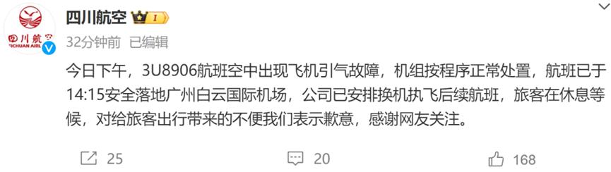 据@四川航空消息,2月7日下午,3U8906航班空中出现飞机引气故障,机组按程序正常处置,航班已于14:15安全落地广州白云国际机场,公司已安排换机执飞后续航班,旅客在休息等候,对给旅客出行带来的不便我们表示歉意,感谢网友关注。