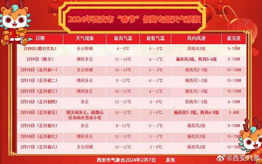 西安气象2月7日发布“春节”假期专题天气预报:假日前期(8-13日)以晴到多云天气为主,后期受弱短波槽东移影响,14-15日有一次弱雨雪、降温过程,日平均气温下降3~5℃。气温方面,8日起气温快速回升,9日(除夕)起最高气温可升至10℃~15℃,最低气温-4℃~0℃。另外9日夜间至10日白天、14日白天至夜间,有吹风天气。