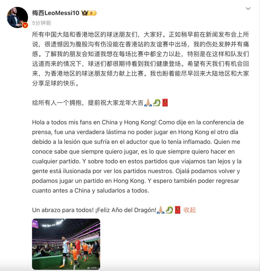 北京时间7日晚,迈阿密国际队与神户胜利船队在日本东京进行了一场表演赛,备受关注的梅西替补登场。同日下午5时57分,梅西的微博账号发文,全文如下:所有中国大陆和香港地区的球迷朋友们,大家好。正如稍早前在新闻发布会上所说,很遗憾因为腹股沟有伤没能在香港站的友谊赛中出场,我的伤处发肿并有痛感。了解我的朋友会知道我想在每场比赛中都全力以赴,特别是在这样和队友们远道而来的情况下,球迷们都很期待看到我们健康登场。希望有天我们有机会回来,为香港地区的球迷朋友倾力献上比赛。我也盼着能尽早回来大陆地区和大家分享足球的快乐。详情: