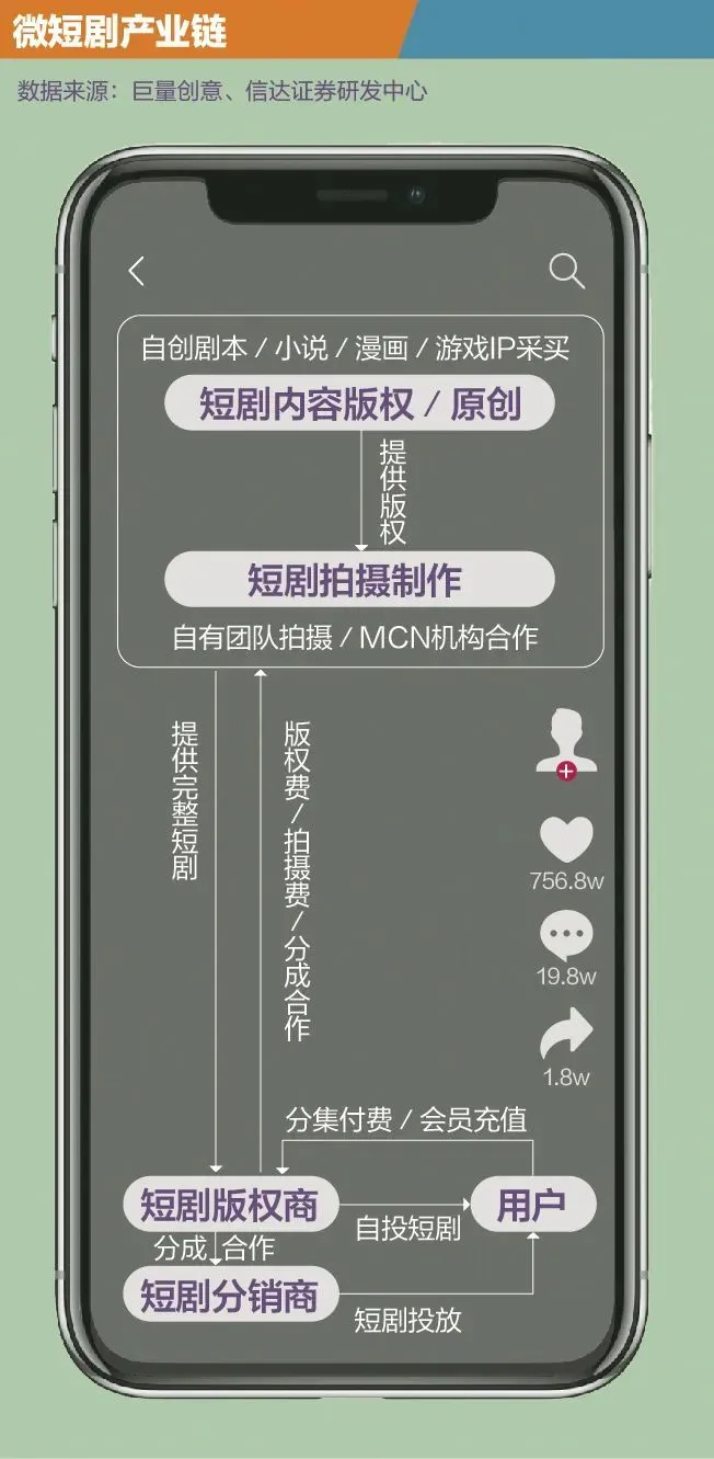 微短剧产业链已逐步走向成熟,通常可以划分为上游、中游、下游三大部分。上游是微短剧的内容生产,主要由版权方、出品方和承制方参与,进行版权购买、IP孵化、剧本编写、组建团队和成片拍摄等工作。中游则是微短剧的内容分发,主要由平台方和分销方参与,进行平台搭载、短剧分销等。下游通常是微短剧的生态支持,主要由媒体方、代理方等参与,进行流量投放。