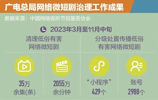 实际上,自去年以来,广电总局就已持续开展网络微短剧治理工作。截至2023年2月28日,共下线含有色情低俗、血腥暴力、格调低下、审美恶俗等内容的微短剧25300多部、计1365004集,下架含有违规内容的“小程序”2420个,遏制了网络微短剧野蛮生长的态势。
