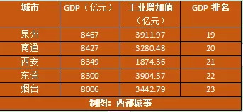 根据今年前三季度的全国主要城市GDP排名,第19—22名的四个城市分别是南通、东莞、西安、泉州,它们的GDP刚好都处于6000亿级别。