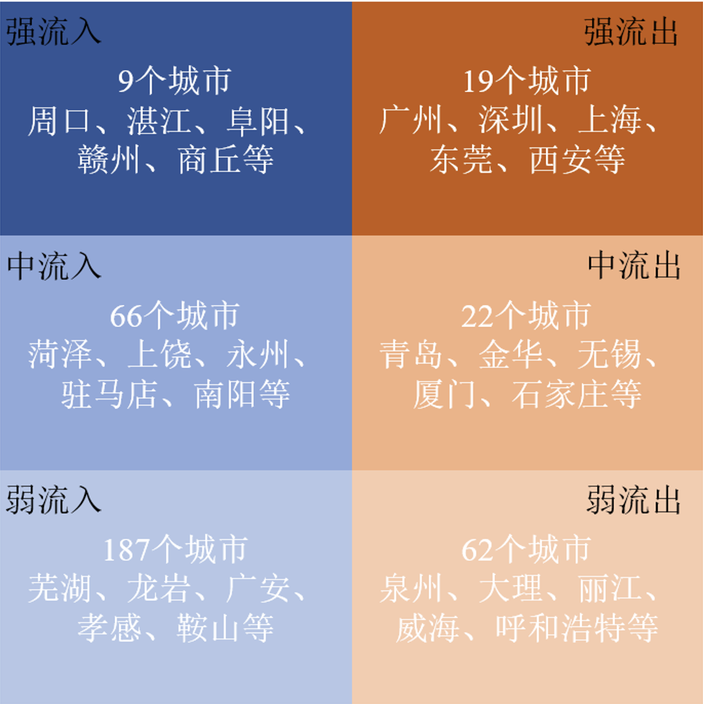 根据春运预测结果,报告将城市划分为强(>300万)、中(100-300万)、弱(<100万)流入/流出城市。